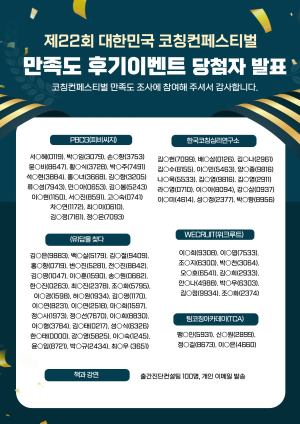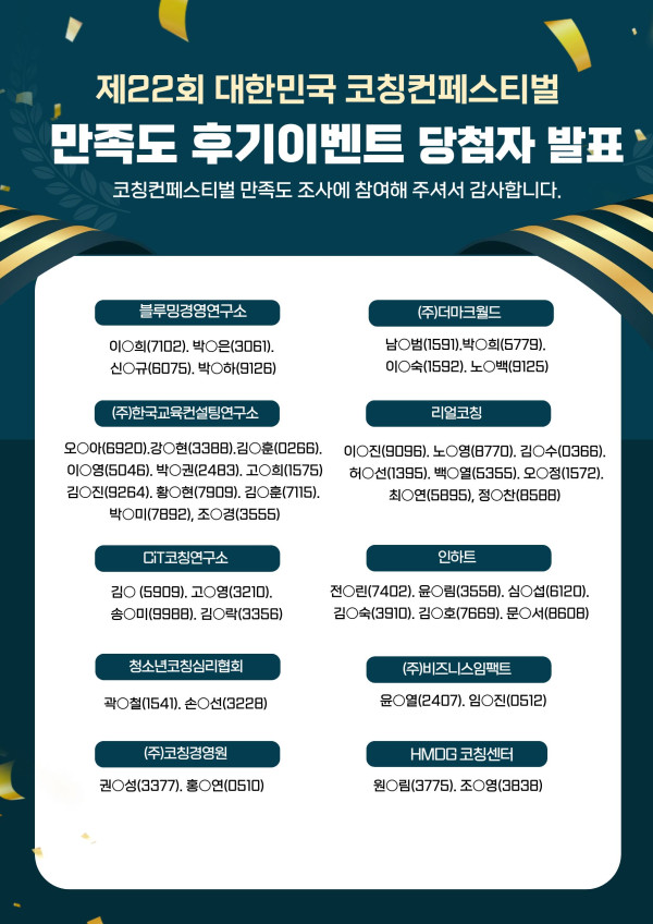 제22회 대한민국 코칭 페스티벌 - "만족도 후기 벤트" 당첨자 안내