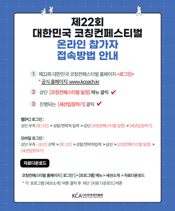 [안내] 온라인 참가자 접속 방법 안내 페이지 정보 작성자 최고관리자 댓글 0건 조회 57회 작성일 25-10-29 15:14 본문 목록 이전글[안내] 코칭컨페스티벌 온라인 접속 오류 발생 시 관련 문의처 안내 25.10.29 다음글[안내] 세션 자료 다운로드 안내 (로그인 필수) 25.10.28