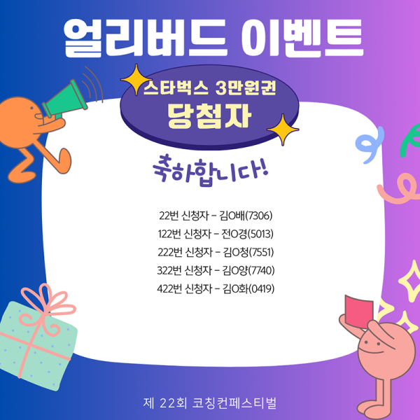 제22회 대한민국 코칭컨페스티벌 '얼리버드 등록 이벤트' 당첨자 안내 페이지 정보 작성자 최고관리자 댓글 0건 조회 18회 작성일 25-10-15 11:01 본문 목록 다음글제22회 대한민국코칭컨페스티벌 ‘Coach on the Screen’ 참여 이벤트 안내 (~10/15) 25.10.13
